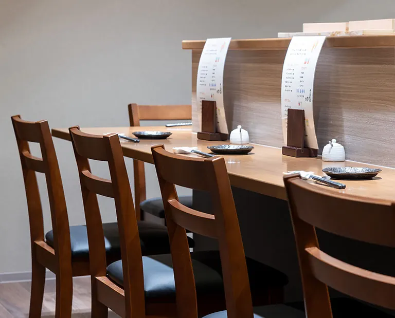 和に寄りすぎないモダンな空間には、調理の手元を眺められるカウンターとゆったり寛げるテーブル席をご用意。人数やシーンに合わせて、お気に入りの席でおくつろぎください。