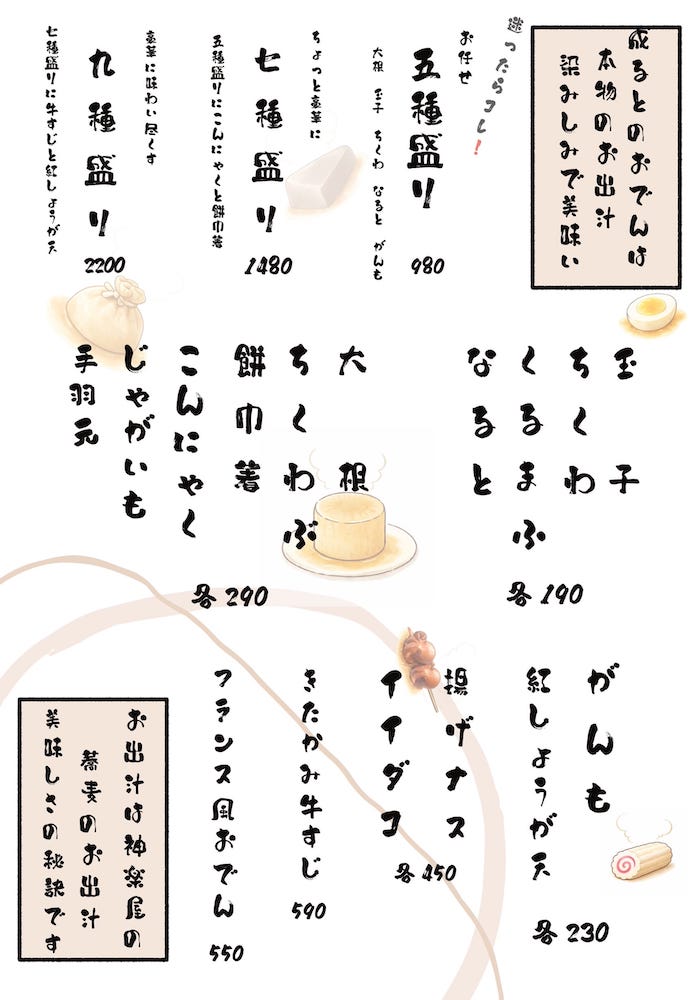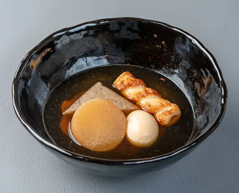 ちくわぶや魚粉で関東・静岡風のおでんを楽しめるほか、出汁炊きお稲荷、フランス風おでんなどユニークなメニューも。