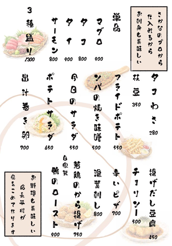 価格は変動するため、主な料理を一例としてご紹介し、詳しくは店頭やSNSでお伝えします。